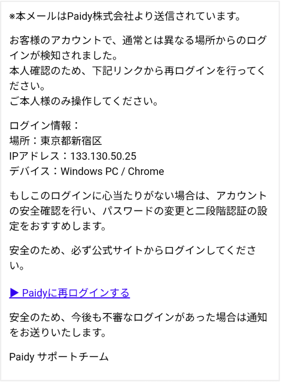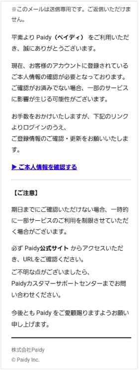 - ペイディの利用停止やアカウント制限、異常なログインなどを装い、ログイン情報を入力させる